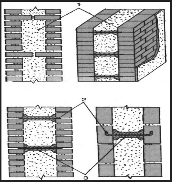 - На излетия разтвор се монтира подсилена мрежа, за да се придаде твърдост на конструкцията, или в процеса на полагане между слоевете в шахматна дъска, свържете 2 стени с подсилващи снопове с огънати ръбове и антикорозионно покритие. Гъвкавите връзки са алтернатива на армировката. Изработени са от фибростъкло или базалтова пластмаса, не са обект на корозия, със спрей от едър пясък за по-голяма фиксация и вграден фиксатор за закрепване на изолацията към стената.