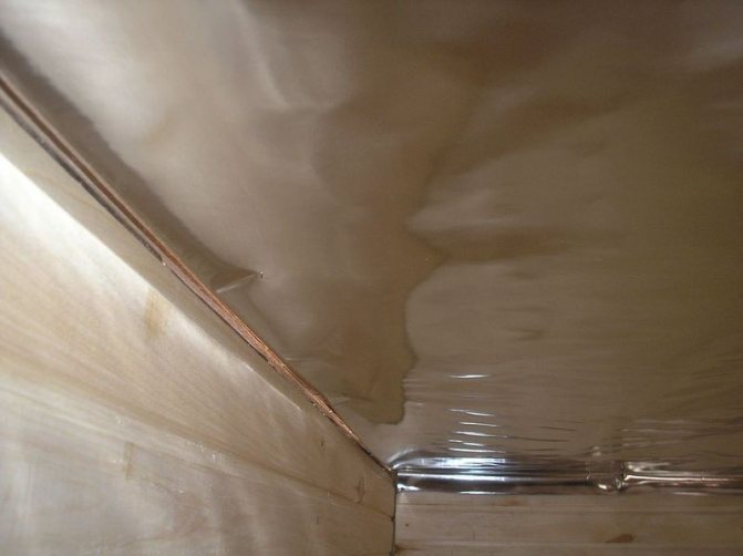 При завършване на банята с фолио е важно да се осигури отводняване на кондензат. В този случай платното се показва на стените и пода. Материалът от фолио трябва да се полага с припокриване от 20 см и да се залепва с фолио. За да се осигури ефект на термос, между фолиото и декоративната облицовка трябва да се постави 15 мм междина.Той ще осигури вентилация и ще гарантира здравословен микроклимат.