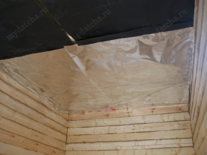 Вместо алуминиево фолио може да се използва восъчна хартия или тежък картон. Предварително се напоява с ленено масло. Но върху такава пароизолация ще е необходимо да се постави слой глина, едва след това можете да започнете да се затопляте. Фолиото е фиксирано с пръти 2 х 3 см. Това ще запази обмяната на въздух и по-късно можете да инсталирате декоративни облицовки върху прътите.