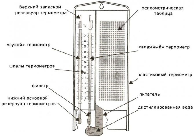 За да разберете как да използвате психрометричния хигрометър VIT-2, трябва да имате представа за външния му вид, както и за принципа на действие. Визуално това е пластмасова основа с височина 290 мм, ширина 120 мм и дебелина 50 мм. На тази основа са фиксирани два термометра, както и температурна скала и психрометрична таблица. Освен това там е фиксирана и стъклена подаваща машина, която е необходима за овлажняване на един от термометрите.