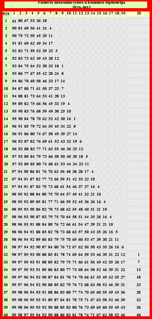 За да направите необходимите изчисления, е достатъчно да използвате таблицата. След като намерят получените индикатори на "сухи" и "мокри" термометри, в точката на пресичане на тези стойности ще бъде показана относителната влажност на въздуха.