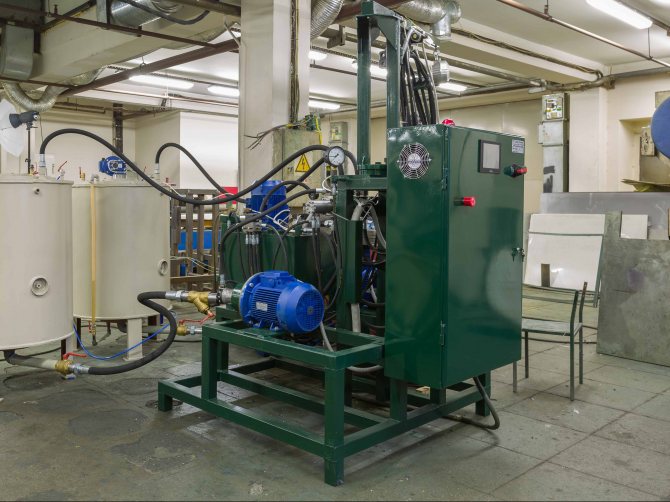 За изливане на стените на PPU се използват изливни комплекси. Такова оборудване ви позволява точно да дозирате компонентите, за да получите полиуретанова пяна, да ги смесите до хомогенно състояние и да ги излеете в пространството между стените. Инсталациите са с високо налягане (над 100 атмосфери) и ниско налягане (4-10 атмосфери).