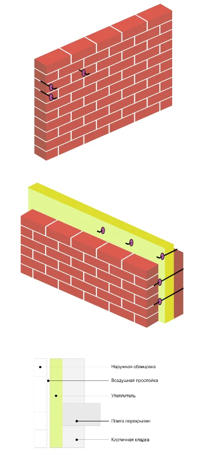 Непрактично е да се използва такъв брой тухли поради натоварването върху основата и сложността на монтажа, поради което стените са направени двуслойни. Издигат се вътрешни и външни, като между тях остава пространство от 50 сантиметра за свободна циркулация на въздуха. Това помага да се запази топлината и да се предотврати образуването на конденз. Но това не е достатъчно за пълноценна изолация. Трудно е да се изолира пространството между стените с валцувани или меки материали. Методът за запълване на кухините с PU пяна ви позволява равномерно запълване на всички празнини вътре в стените и между тях.